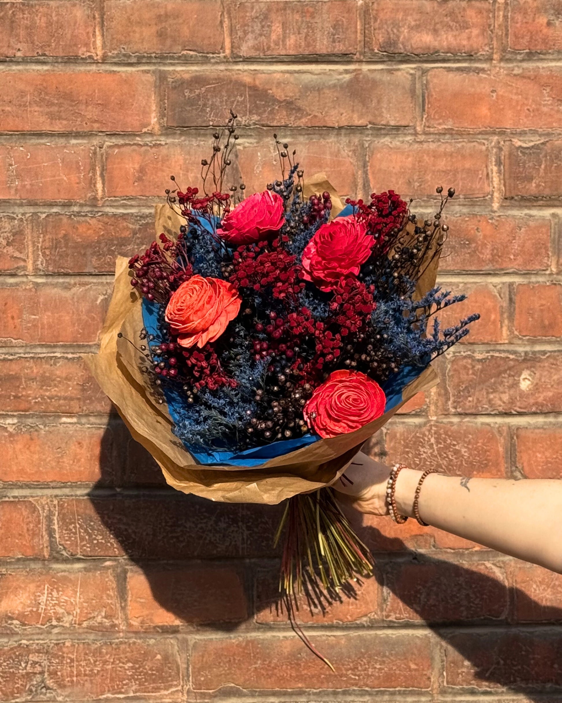 bukiet z roślin suszonych w kolorach czerwonym, niebieskim i granatowym z kwiatami shola