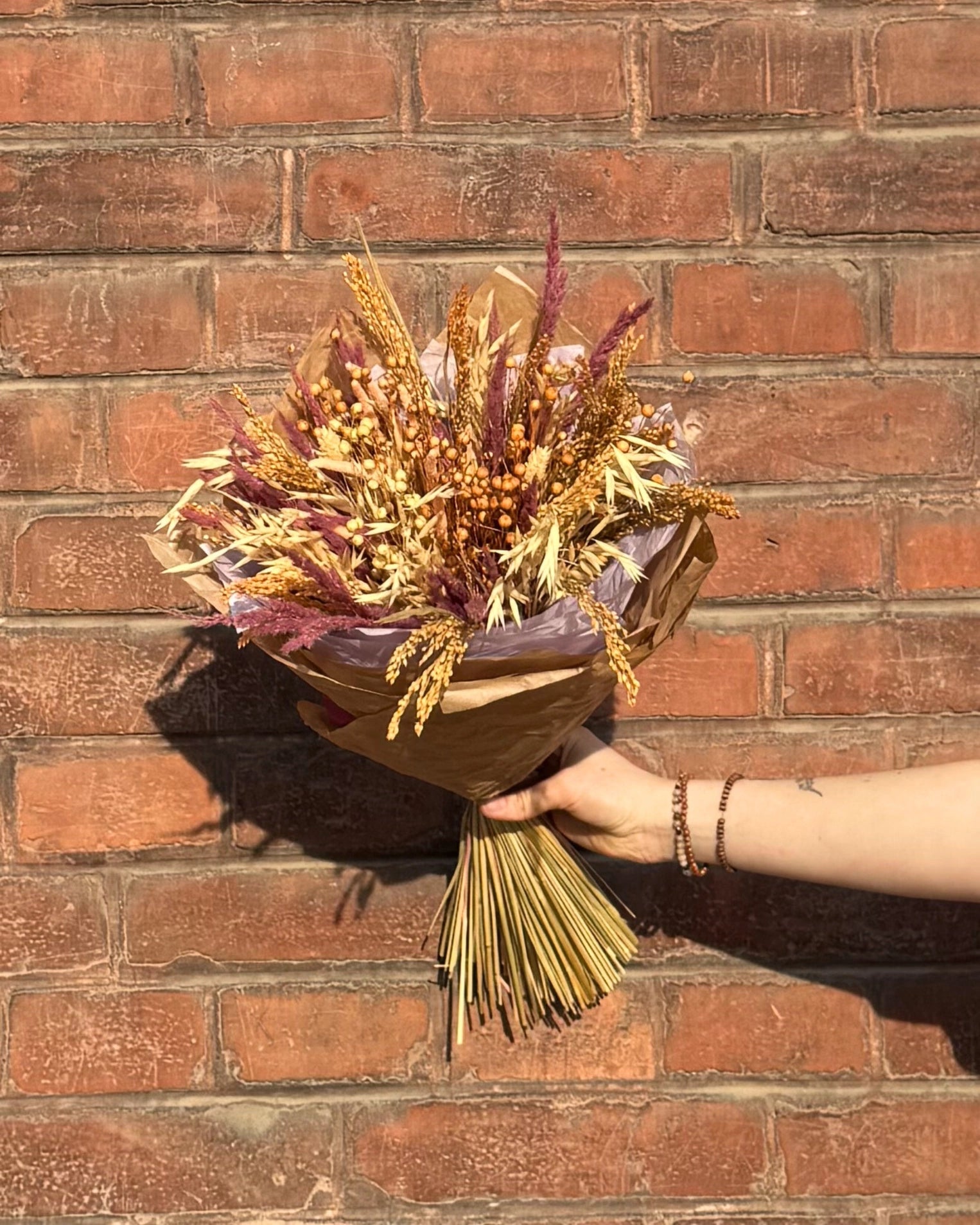 bukiet z roślin suszonych w kolorach beżowym, pomarańczowym i różowym